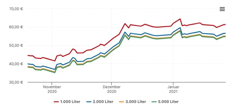 Die gezeigte Abbildung veranschaulicht die Veränderung der Heizölpreise in Mainz gemessen im Zeitraum vom November 2020 bis Januar 2021. Zu sehen ist eine durchgehende Steigung mit einer anschließenden Stagnation zum Anfang des Monats Januar. Zukünftig ist ähnlich wie in anderen Städten Deutschlands leider mit einem erneuten Anstieg zu rechnen. Jedoch bleibt abzuwarten, was die Zukunft mit sich bringt, da Erdöl ähnlich wie andere Roh- und Heizstoffe preislich sehr schwankend ist.