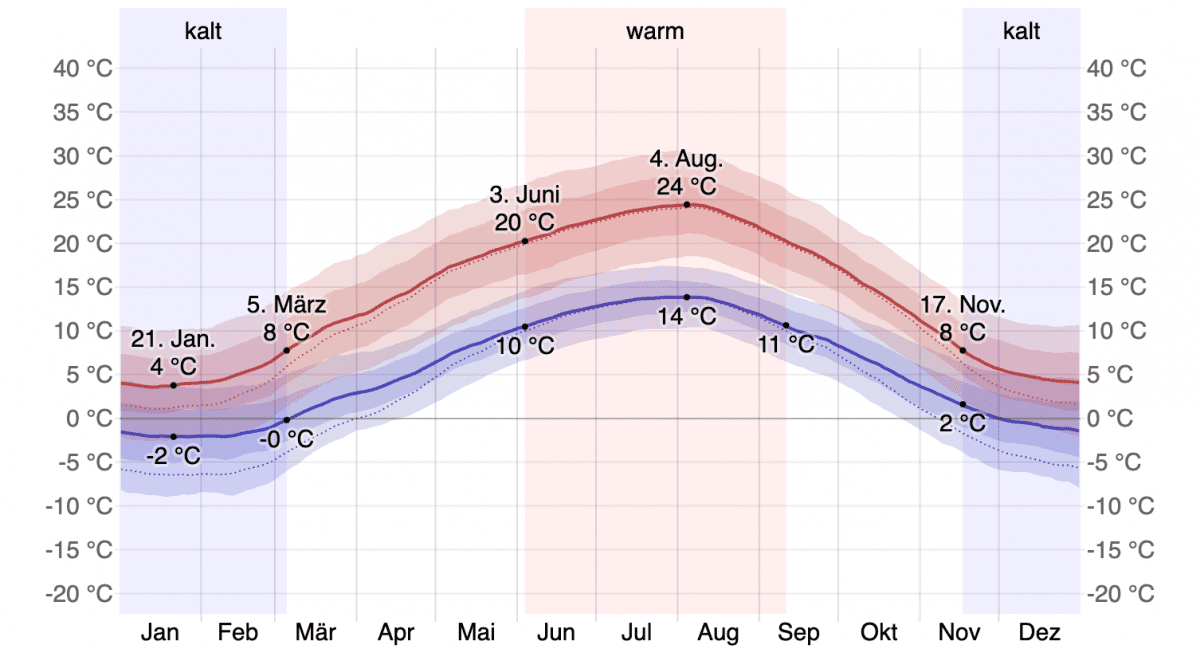 Bevor eine passende Heizungsanlage ausgewählt wird, sollten Sie einen Blick auf das durchschnittliche Klima von Reutlingen werfen. Reutlingen liegt in Baden-Württemberg und ist von zahlreichen Hügeln und bewaldeten Anhöhen umgeben. Der höchste Berg in der Umgebung ist der Georgenberg mit einer Höhe von 855 Metern, während der tiefste Punkt in Reutlingen auf etwa 330 Metern über dem Meeresspiegel liegt. Das Klima in Reutlingen ist mild und feucht. Die durchschnittliche Jahrestemperatur beträgt 10,1 Grad Celsius und die jährliche Niederschlagsmenge liegt bei etwa 980 Millimetern.