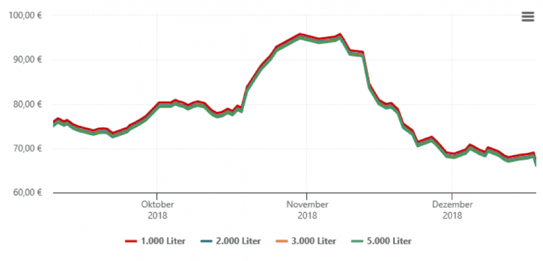 Heizölpreise für Wuppertal – betrifft eine Lieferstelle und verschiedene Mengen (Stand 18.12.2018):